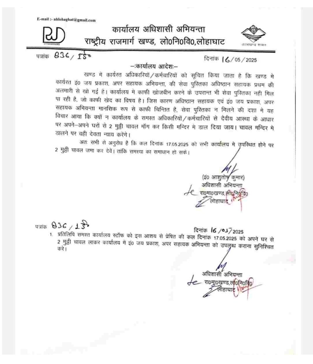 अधिशासी अभियंता, राष्ट्रीय राजमार्ग खंड, लोक निर्माण विभाग, लोहाघाट द्वारा जारी एक विशेष कार्यालय आदेश के अंतर्गत खंड में कार्यरत अधिकारियों और कर्मचारियों से एक अनोखी अपील की गई है। यह अपील खोई हुई सेवा पुस्तिका को लेकर की गई है, जो अपर सहायक अभियंता श्री जय प्रकाश की है और काफी खोजबीन के बावजूद कार्यालय में नहीं मिल सकी।